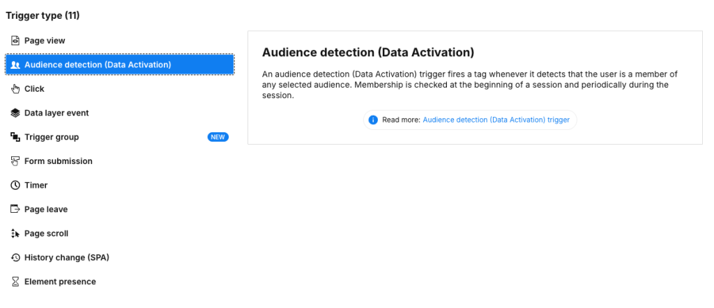 An audience detection (Data Activation) trigger, formerly an audience detection (CDP) trigger, fires a tag when a visitor is a member of any or a specific audience. Membership is checked at the beginning of a session and periodically during the session.